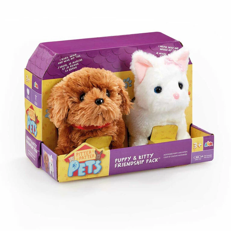 R Exclusive, only available at Toys R Us Canada. Pitter Patter Pets Puppy and Kitty Friendship Pack like nothing better than to be your best friend and always make you smile and happy. This special pack includes a cute little chocolate brown labrador puppy and a lovable little white kitten as the best of friends! This puppy can walk by itself, will wag their tail showing you the excitement they are having with you and will bark if you are not giving them enough attention. Also it encourages activity and movement as the puppy loves going for walks. This lovable little kitten cat not only looks adorable but it also goes for walks with you! Your little ones will love interacting with their new feline friend as it meows and wiggles its tail. If your child wants a pet, it’s great for encouraging young children to engage in fun and exciting role play. The Pitter Patter Pets Puppy and Kitty Friendship Pack helps to stimulate learning from a young age by helping them to nurture for their pet.