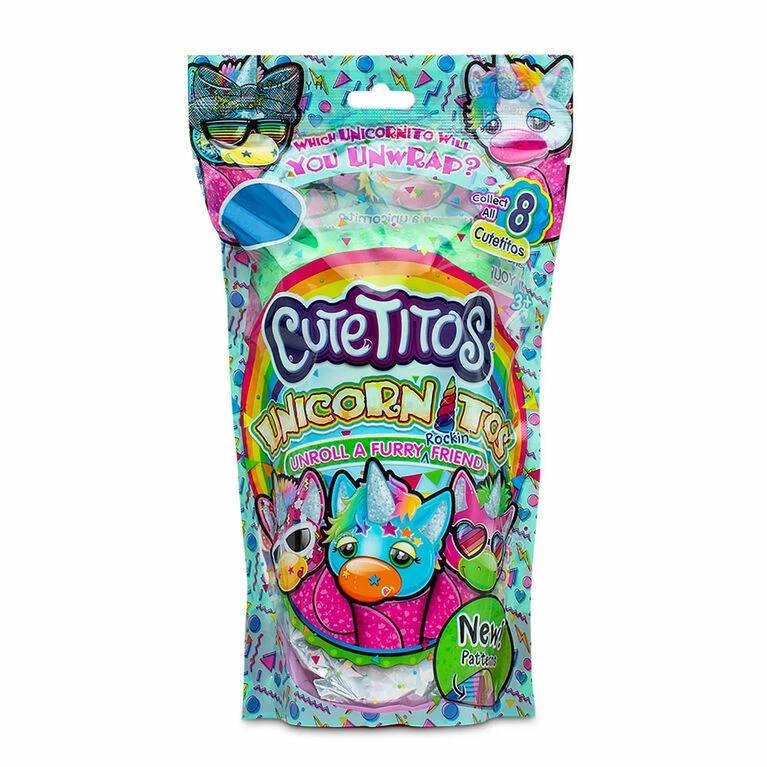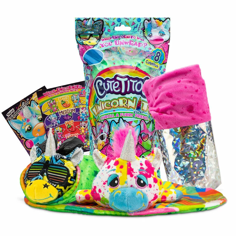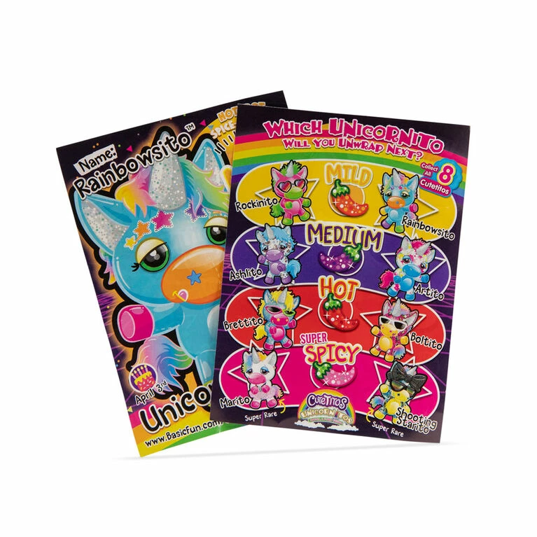 Cutetitos are more magical than ever, in brand new limited edition Unicornitos! Collect 8 all new styles of Unicornitos in beautiful prints and featuring rainbow burrito wraps! Cutetitos Unicornitos are adorable, super-soft stuffed unicorns wrapped and hidden in a rainbow burrito blanket ready to be unrolled and discover your Cutetito’s personality is mild, medium, hot, or super spicy, just check out its “hot spot” – a chili pepper shaped icon you can find on its hip! From Ribbonito to Flowerito, and evem Glitzito, there are 8 brand new Cutetitos to collect! A pet collector card is included with additional information about your new pet including its name, birthday and “hot spot” spice-o-meter rating. Collect them all.
