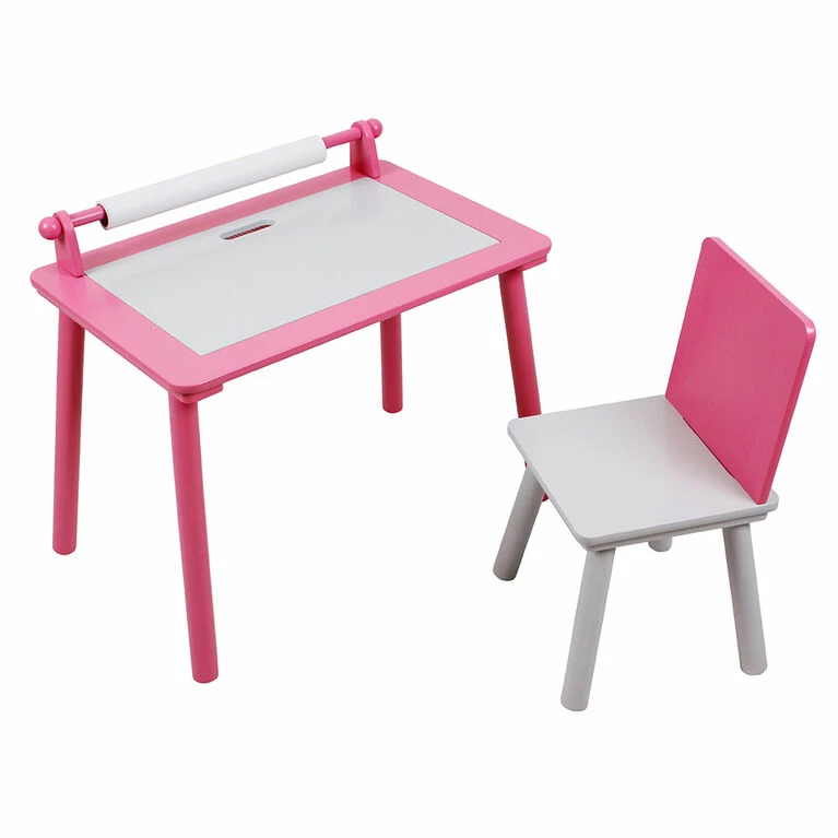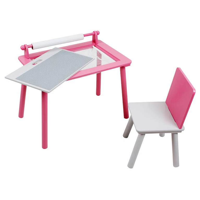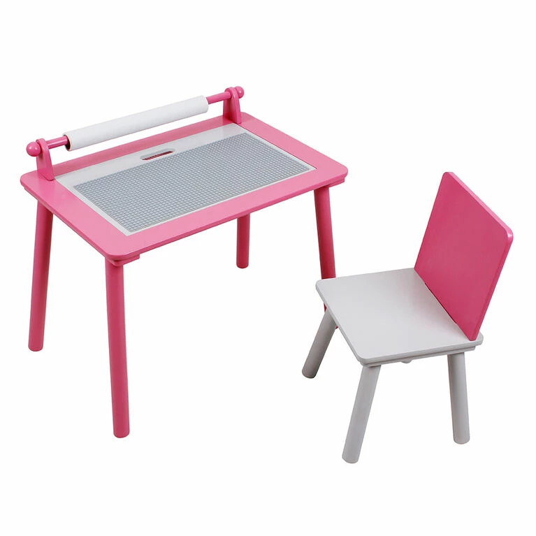 This beautiful activity table and chair will keep your little one busy and entertained for hours! Includes: a construction building base, storage net, art paper roll holder with over 16ft of paper.