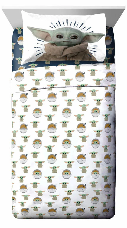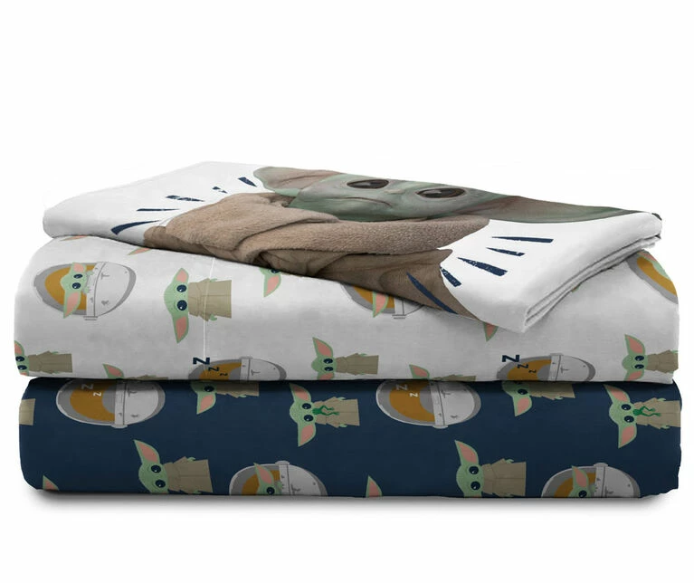 Get cozy with this super cool Star Wars: The Mandalorian ‘The Child’ 3-Piece Twin Sheet Set! Your child is sure to love the design featuring Grogu (a.k.a The Child) from the hit show! This set includes a fitted sheet, a flat sheet and a standard pillowcase. Made from 100% polyester, this cozy sheet set is soft to the touch and machine washable for easy and convenient care. Coordinates with other Star Wars: The Mandalorian bedding items for even more fun and style!
