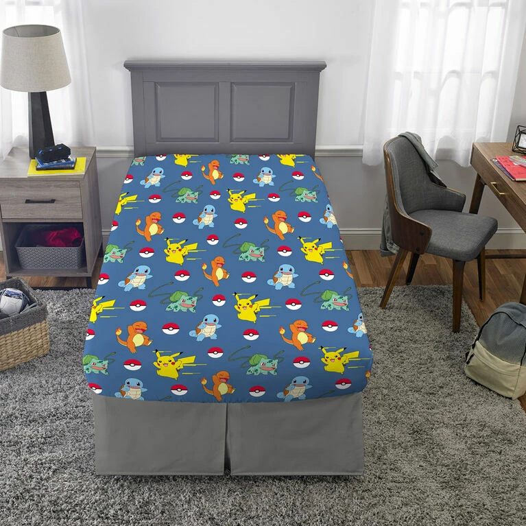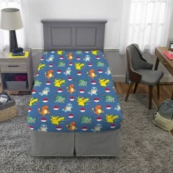 After a long day of catching poke balls, your little gamer will be ready to climb into bed and wrap himself in this soft microfiber sheet set. With his favorite Pokemon by his side, he’ll wake up recharged and animated for the day. This bedding set includes a high-quality fitted sheet, flat sheet, and pillowcase(s) for a coordinated look. It is crafted from super soft microfiber featuring an allover character print of Pikachu, Charmander, Squirtle and Bulbasaur on the blue fitted sheet, a bold multicolor lightning bolt symbol on the white top sheet, and a double sided pillowcase with cheerful prints of Pikachu on color-blocked backgrounds. A great way to add some bold color and excitement to their bedroom, this PokΓ©mon sheet set will supercharge their bed with comfort and fun. Set is available in a twin size 3 piece bedding set or a full size 4 piece bedding set.