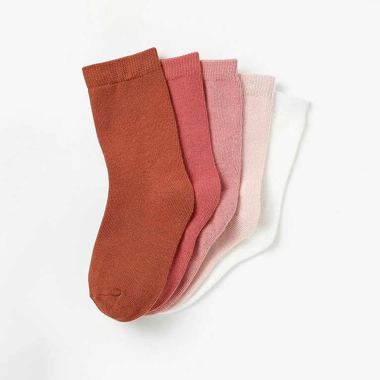 Tiny toes stay warm and dry in these ultra-soft basic crew socks. A pack includes 5 pairs of socks, composed of 78% cotton, 21% polyamide, and 1% elastane. Easy to slide on for an adventure. Available in white, black, pink, blue, or stripes to match any young oneβs wardrobe.