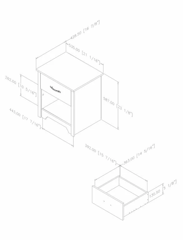 South Shore is proud to stand behind this 1-drawer nightstand – end table with storage with an exclusive 5-year limited guarantee. Shop with confidence knowing your purchase is always covered. All our products meets or exceeds North American safety standards and our packaging are tested and certified to reduce the risk of damage during shipment. This item is shipped in 1 box, make sure to have a friend with you. Assembly is required by 2 adults and tools are not included. If you have questions regarding this product or need assistance do not hesitate to contact South Shore Furniture 7 days support. This product is made in North America with laminated particleboard. Accessories not included.